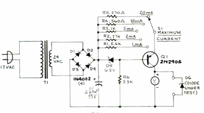 The purpose of this circuit, which we found in the November 1986 Radio Electronics issue, is to determine the voltage across a zener diode. Several test currents can be selected.
