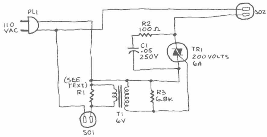 The idea of this circuit is that when the device in SO1 is turned on, the device connected to SO2 automatically receives power. The circuit is from Radio Electronics from January 1985.