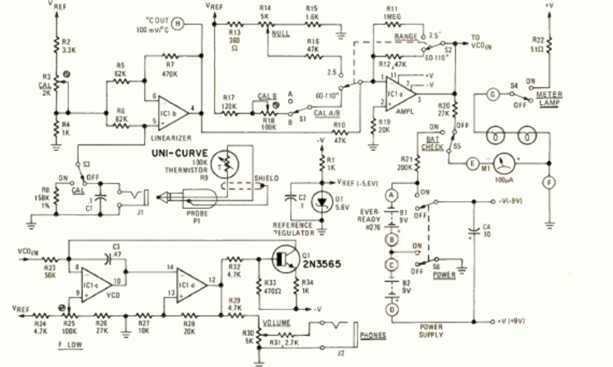 This circuit was found in February 1976, Radio Electronics magazine. The circuit is quite sophisticated using a fast-acting (thermometric) sensor and analog indicator.
