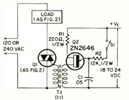 This triac control circuit with transformer and unijunction transistor was found in the June 1970 issue of Radio Electronics magazine. The transformer has a 1 to 1 turns ratio.