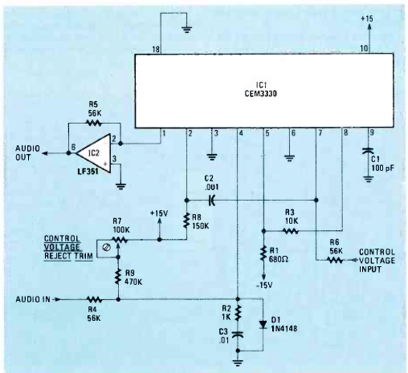 This circuit for effects on music synthesizers was found in the May 1983 issue of Radio Electronics magazine. The circuit requires a 15 V power supply.