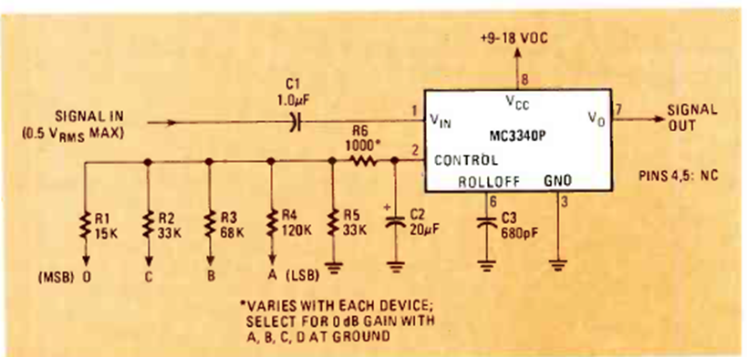 With this circuit it is possible to control the intensity of a signal digitally. The circuit is from Radio Electronics from February 1981. The power supply must be 18 V.