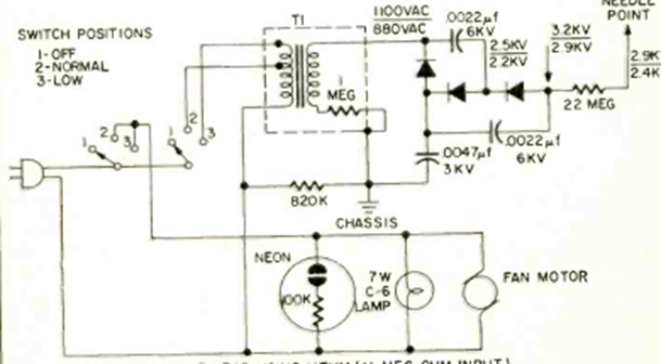 We found this ionizer circuit in a Radio Electronics magazine from May 1971. The high voltage transformer is a special type of the time that provides 800 to 1100 Vac.