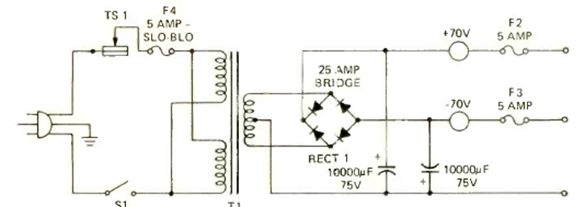 This circuit is the power supply for the amplifier in the previous circuit. The transformer is 5 A with a voltage of 45 V, obtaining 70 V after rectification.