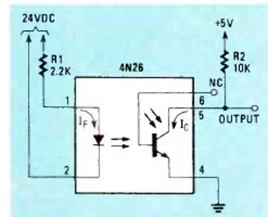 The figure shows how to interface a 24 V signal with TTL logic using a 4N26 coupler. The circuit is from Radio Electronics from May 1985.