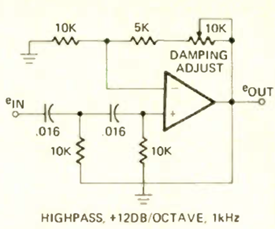 This circuit is similar to the previous one with 120 dB per octave. It was found in the July 1975 issue of Radio Electronics magazine. Any operational amplifier, such as the 741, can be used.