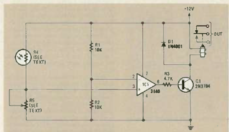 This circuit triggers the relay when the temperature exceeds the value set on the trimpot. The circuit is from Radio Electronics, June 1986. The sensor is an NTC, and the adjustment value depends on this component.