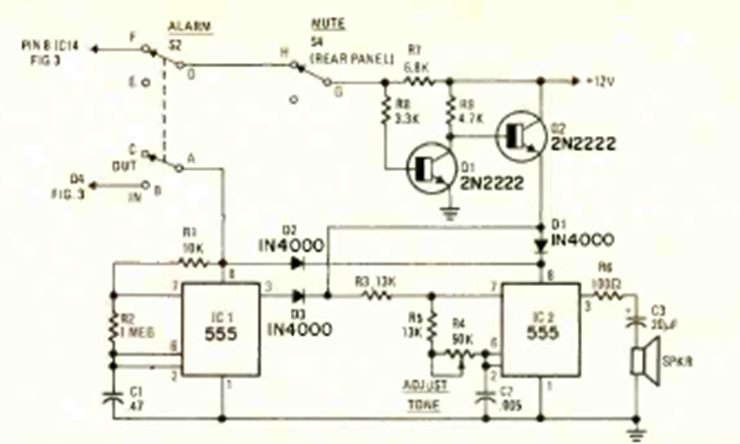 This 555-based circuit was found in the August 1976 issue of Radio Electronics magazine. The tone frequencies are provided by the capacitors connected to the 555 IC.