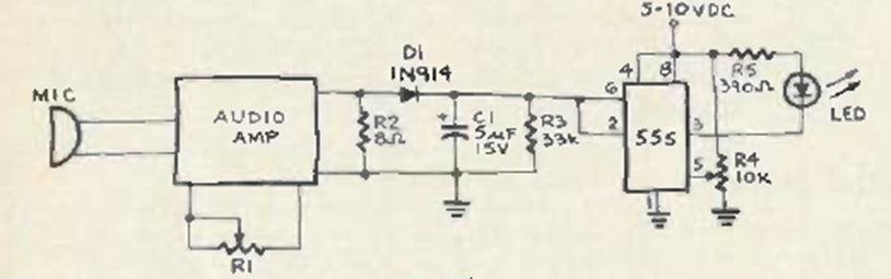 This circuit detects when an audio signal exceeds a certain level or even occurs due to an object falling, a door slamming or other. The circuit is from a Radio Electronics from January 1980.