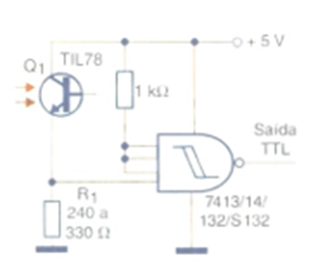 The circuit shown in the figure directly triggers a TTL logic gate, thus requiring a 5 V power supply. Resistor R1 determines the circuit's sensitivity. The output logic level depends on whether the light on the sensor is cut off or an incident on it, remembering that the TTL gate acts as an inverter. Other inverter-trigger functions (Schmitt) can be used in the same configuration.