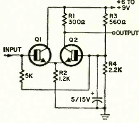This circuit was found in a Radio Electronics issue from May 1970. The transistors are general-purpose, and the power supply can typically be between 6 and 9 V.