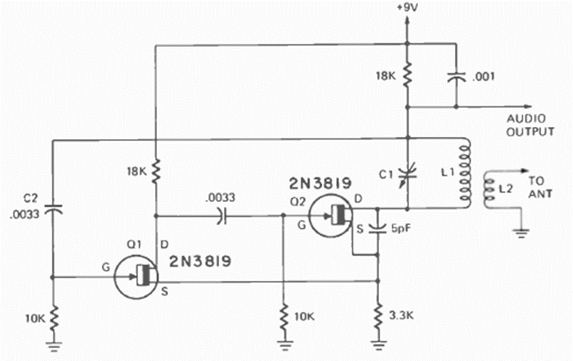 This circuit with an unusual configuration was found in the January 1974 issue of Radio Electronics magazine. The frequency is given by L1/C1, and the transistors admit equivalents.