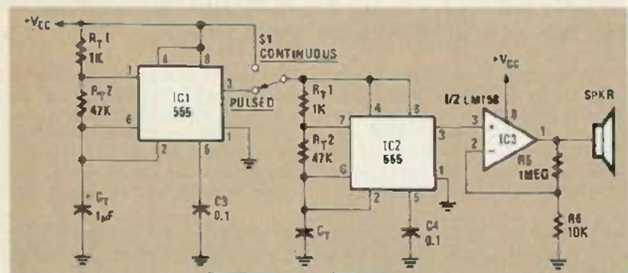 This circuit operates from 25 to 65 kHz depending on the transducer used and the settings. We found it in the Radio Electronics magazine of July 1985. The 9V to 12V power supply is not given.