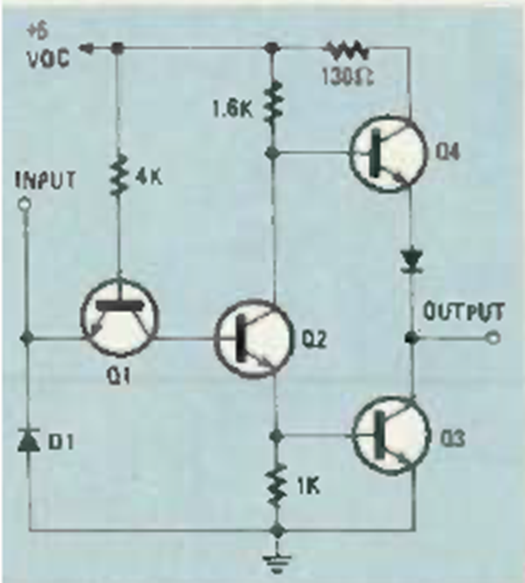 This is the common transistor version of a TTL inverter gate. The transistors are general-purpose and the power supply must be 5 V.