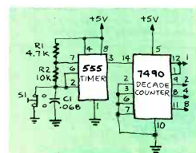 This circuit works with the previous one, generating counting pulses for random draws. The circuit is from Radio Electronics from November 1983. The power supply must be 5 V.