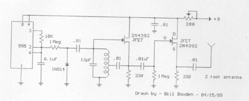 This signaler, depending on the transistor, can have a range of a few hundred meters. The 600 Hz audio tone is given by the 666. The power supply is made with a 9 V battery. The coil consists of 2 + 2 turns of 2 or 28 wire in the shape of 1 cm.