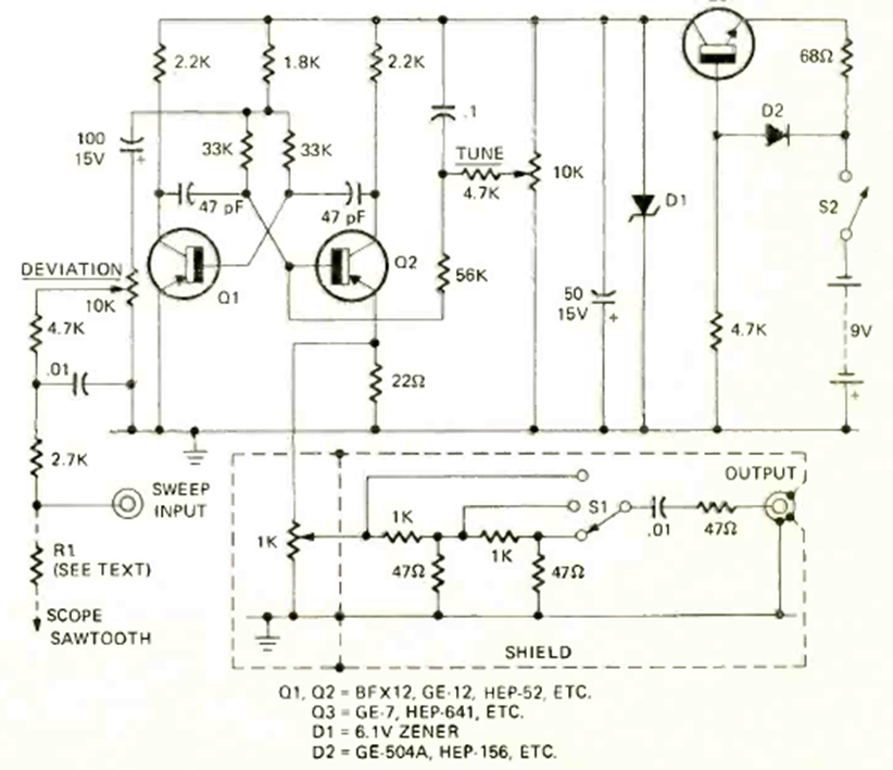 This circuit with transistors of the time was found in the November 1972 Radio Electronics magazine. The circuit also generates a sawtooth signal for use on an oscilloscope.