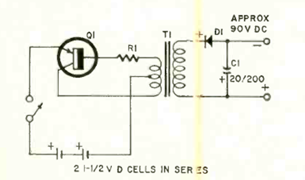 This circuit aims to replace a 90 V battery used in old tube radios. The circuit uses a transformer with appropriate voltage and the transistor can be any power one. Resistor R1 has values between 470 ohms and 4k7 depending on the transistor gain.