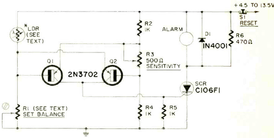 Found in an article in the August 1971 Radio Electronics magazine, this circuit supports 106 series SCRs and general-purpose transistors such as the BC.