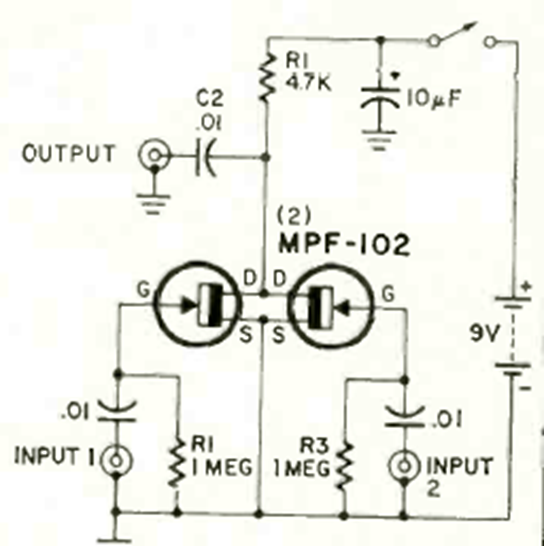 This small general-purpose mixer uses only two transistors. We found it in a Radio Electronics issue from April 1970. It is powered by a 9 V battery.