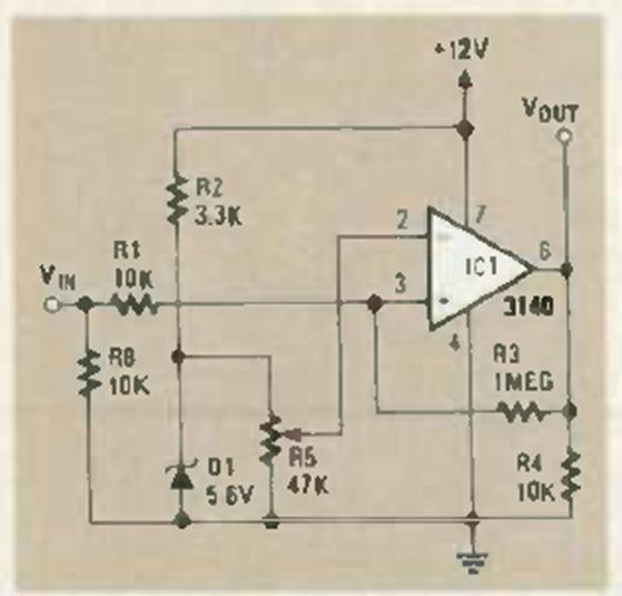 This comparator application circuit was obtained from the June 1986 Radio Electronics magazine. The reference voltage is adjusted from a zener diode.