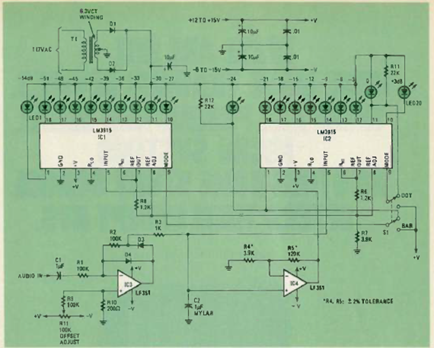 In the figure we have a circuit in which two moving bar/dot indicators are connected together to increase the number of LEDs. The circuit is from a Radio Electronics from October 1980.