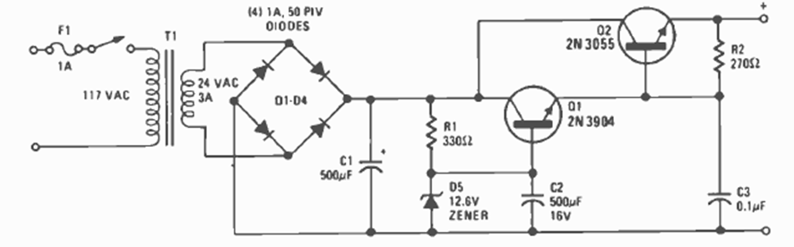To power small projects, we found this circuit in the Radio Electronics magazine of May 1977. The transistor must be equipped with a heat sink.