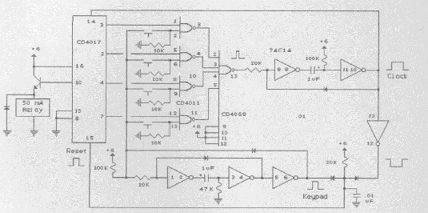 We found this circuit in documentation from the 90s. The circuit has 4 pushbuttons and is powered by voltage according to the relay. The circuit uses CMOS logic and can be modified for more switches.