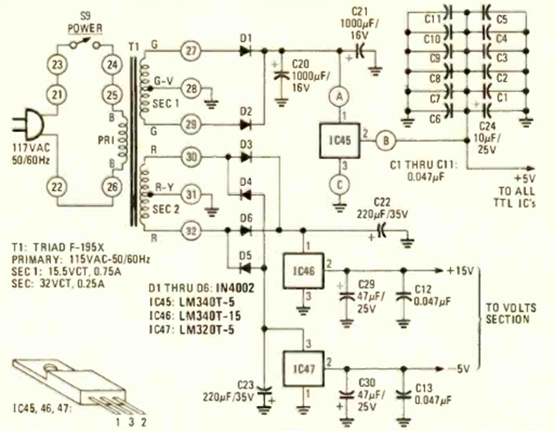 We found this circuit in the April 1979 Radio Electronics magazine. Note the filter capacitor bank that can now be replaced by a single equivalent value capacitor.