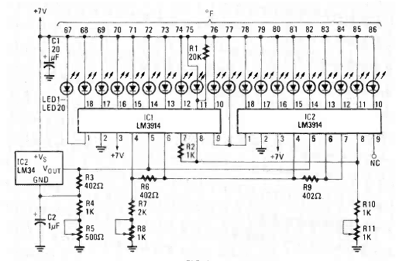 This bargraph circuit was found in the January 1986 issue of Radio Electronics magazine. It is based on the well-known LM3914 and has two of them in cascade driving a good number of LEDs.