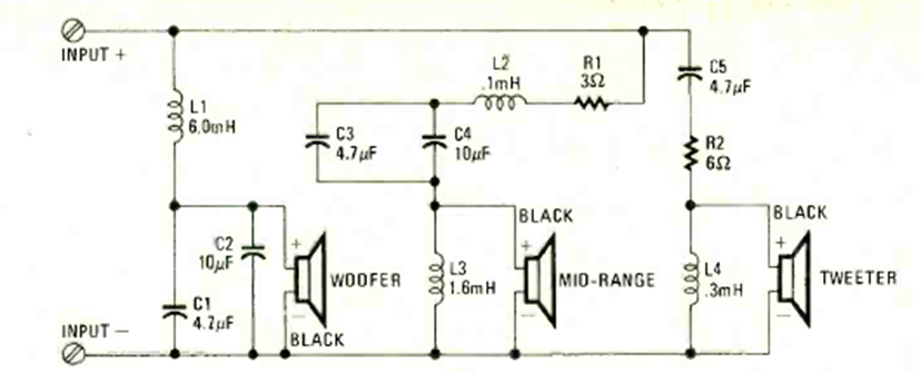 This frequency divider for 3-speaker boxes was found in the December 1978 issue of Radio Electronics magazine. The inductance values should be based on components with current capacities that are compatible with the amplifier power.