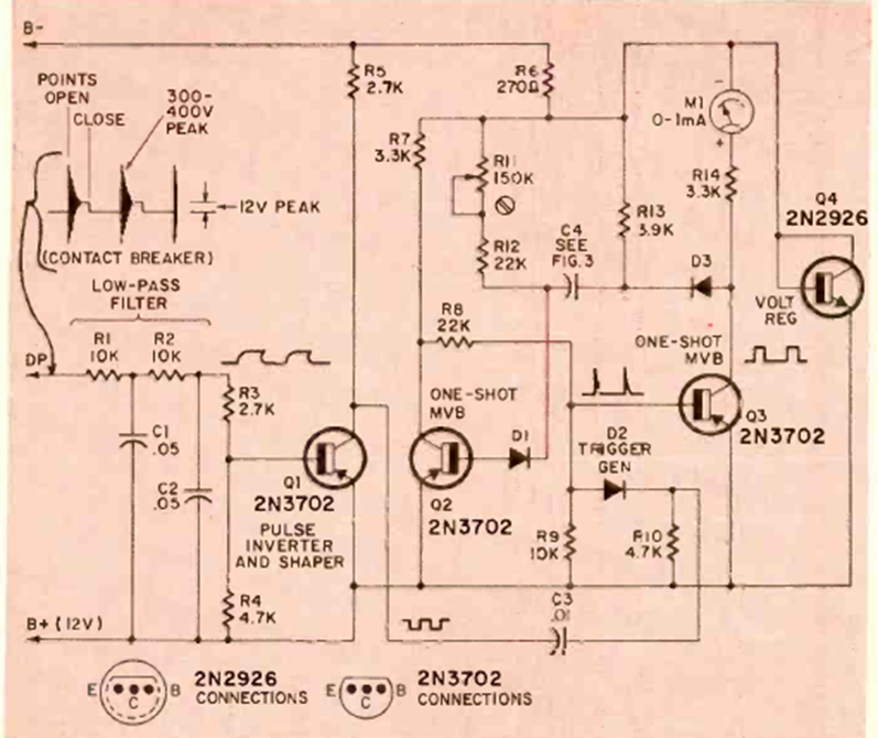 This circuit was found in the April 1970 Radio Electronics magazine. The dual function circuit uses 4 transistors and is connected to the vehicle's contact breaker.