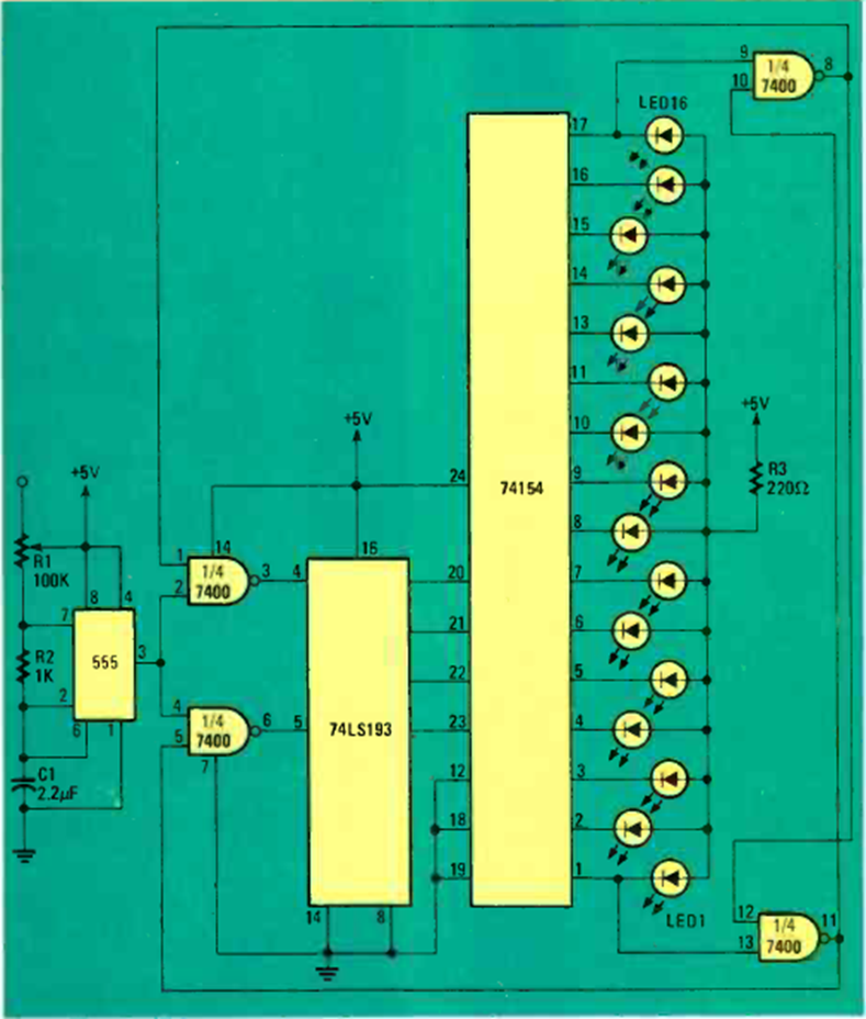 This TTL sequential flasher circuit was found in the January 1981 issue of Radio Electronics magazine. It is powered by 5 V. The frequency can be adjusted by R1.