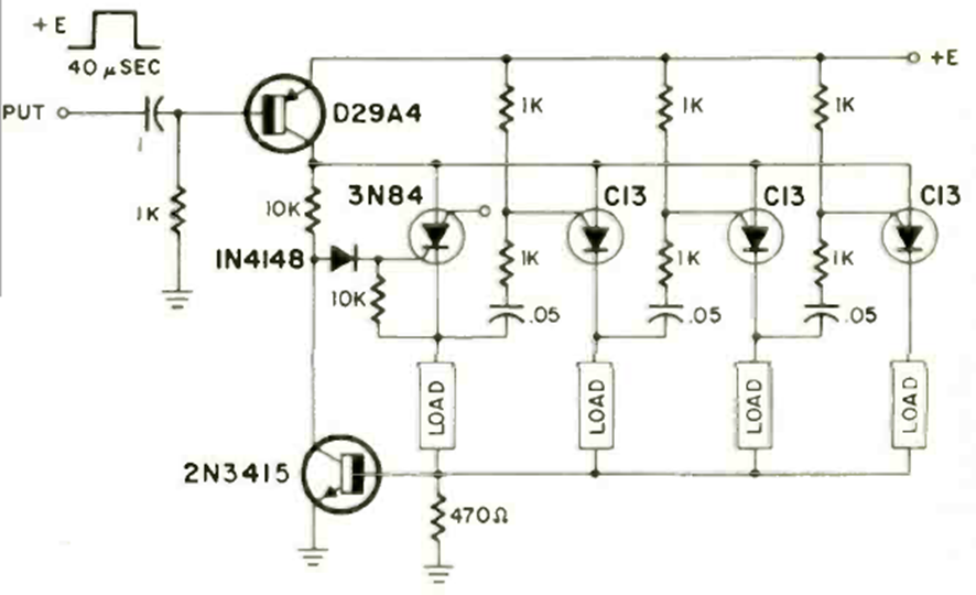 This circuit digitally counts input pulses. The circuit from a November 1970 Radio Electronics uses unijunction programmable transistors. Note the counted pulse duration.
