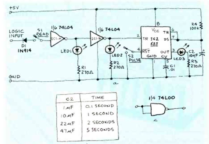 This simple logic test circuit with 3 LEDs was found in October 1985 Radio Electronics magazine. The power supply is according to the logic, and this version is indicated for TTL.