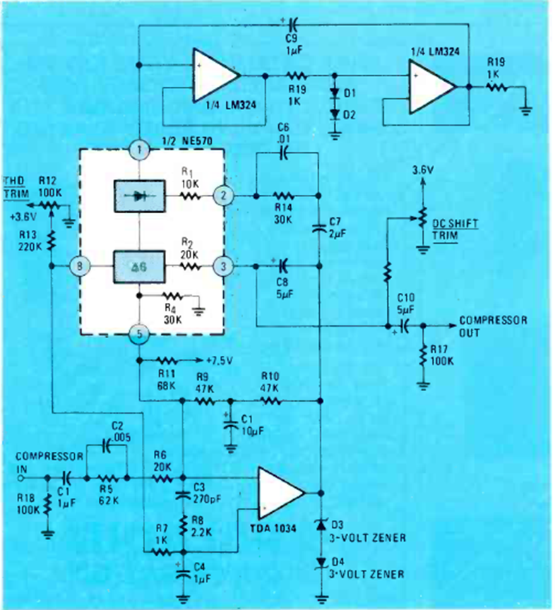 Used in radio reception, this circuit was found in the February 1983 Radio Electronics magazine. The integrated circuit is the NE570 IC, and the power supply is 3.6 V.