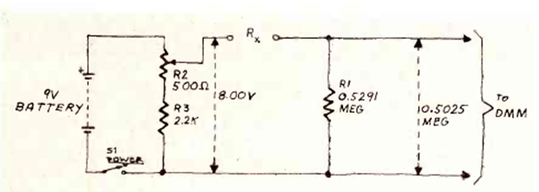 Connected to the low current input of a standard multimeter, this circuit enables the reading of very high resistances, reaching 20 M ohms. The circuit is from a Radio Electronics from October 1982.
