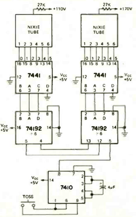 This simple TTL electronic dice uses common anode displays. The circuit is from a March 1975 Radio Electronics. The power supply must be 5 V.