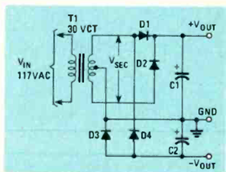 This circuit with 4 diodes was found in the July 1984 Radio Electronics magazine. The voltage of the transformer determines the output voltage and the working voltage of the capacitors.