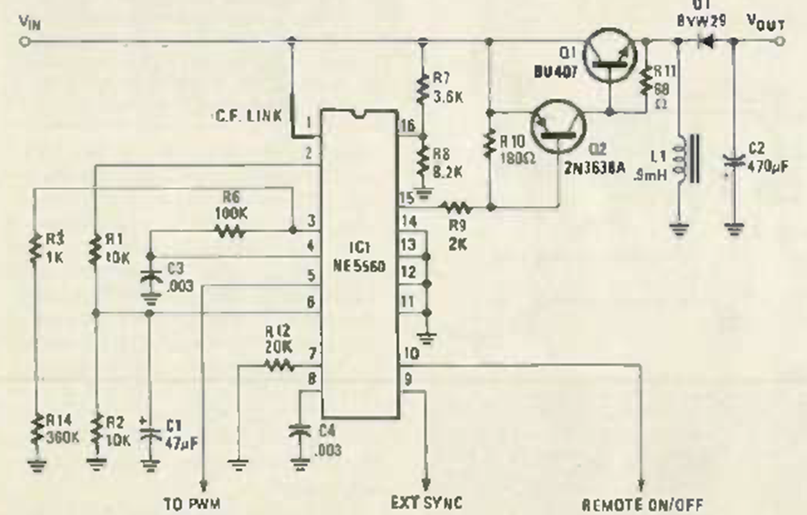 The output of this circuit using the NE5560 has the opposite polarity of the input voltage. The circuit is from a Radio Electronics magazine from February 1980. The power transistor must be equipped with a heat sink.