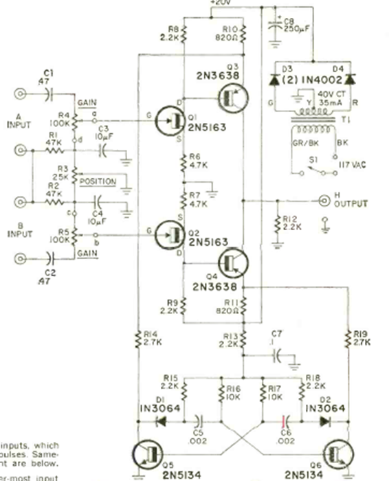 This electronic switch published in the July 1970 Radio Electronics magazine allows the observation of two signals on a simple oscilloscope. The circuit is for signals up to 300 kHz. The transistors are types of the time.