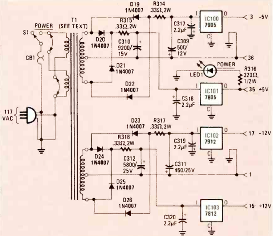 For someone who wants to take advantage of a double transformer in a good power supply, we found this circuit that is part of an article in the magazine Radio Electronics from October 1982. Integrated circuits must be equipped with heat sinks.