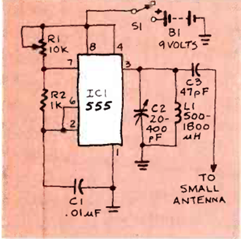 This experimental 555 circuit sends signals in the medium wave band to a receiver a few meters away. The circuit is from a Radio Electronics from April 1982.