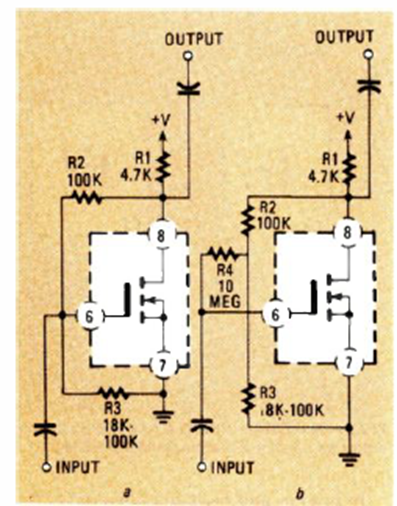 The 4007 integrated circuit consists of 4 MOSFETs that can be used separately. The figure shows how to use these transistors in linear amplifiers.
