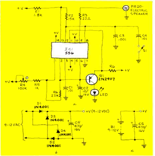 This circuit was published in the Ideas section of Radio Electronics magazine in August 1983. The circuit is based on the well-known 555 and is powered by a voltage of 9 V. Two power supply options are given.