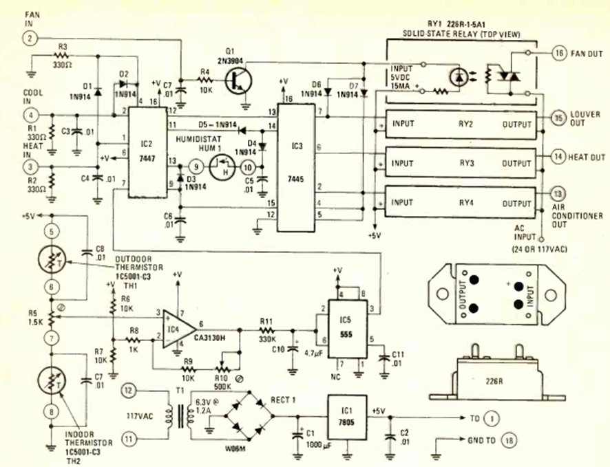 We found this multiple thermostat circuit in July 1980 Radio Electronics magazine. It uses opto-triacs for power control and operates on a 117 VAC mains.