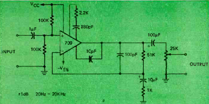 With distortion of less than 1 dB from 10 Hz to 20 kHz this circuit was found in the December 1972 issue of Radio Electronics magazine. The amplifier is a type that preceded the 741, the 709.