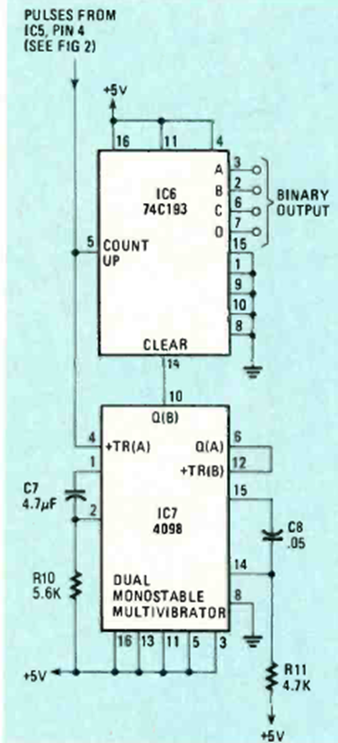 This circuit is designed to be used with the infrared transmitter two circuits before this one. The monostable timing is given by C7. The circuit is from Radio Electronics from August 1984.