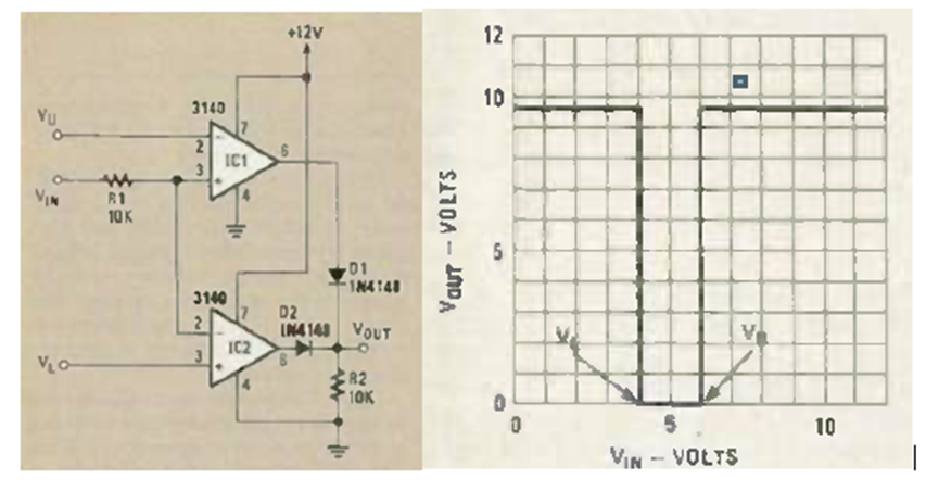 Using the CA3140 in the figure we have a comparator that goes low in the window voltage space. The circuit was found in June 1986 Radio Electronics magazine.