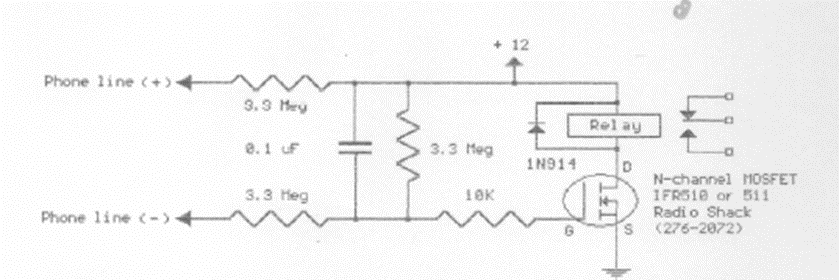 This circuit for old analog telephones is from period documentation. It controls a relay that can be used to turn the extension on and off.